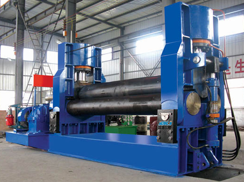 性能與特點: 本機結構型式為三輥對稱式,上輥在下輥中央對稱位置作垂直升降運動,通過液壓缸內的液壓油作用于活塞而獲得,為液壓傳動;兩下輥作旋轉運動,通過減速機的輸出齒輪與下輥齒嚙合,為卷制板材提供扭矩。本機床結構緊湊,操作維修方便。